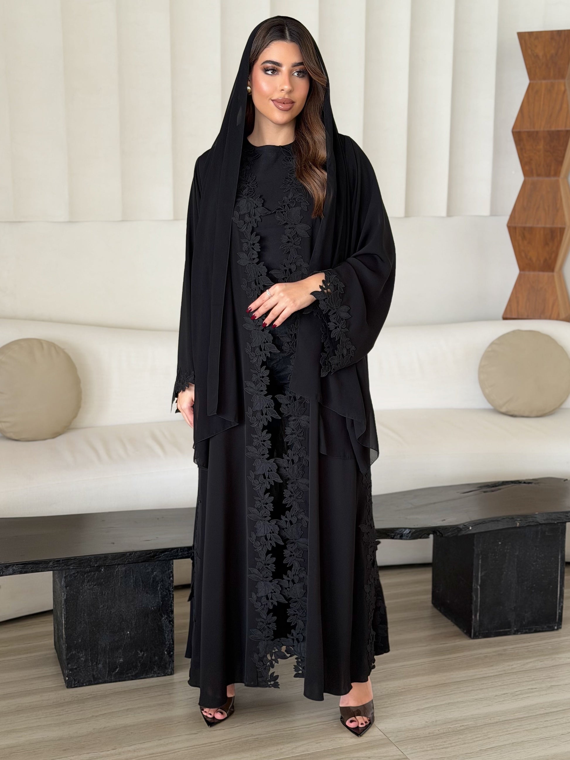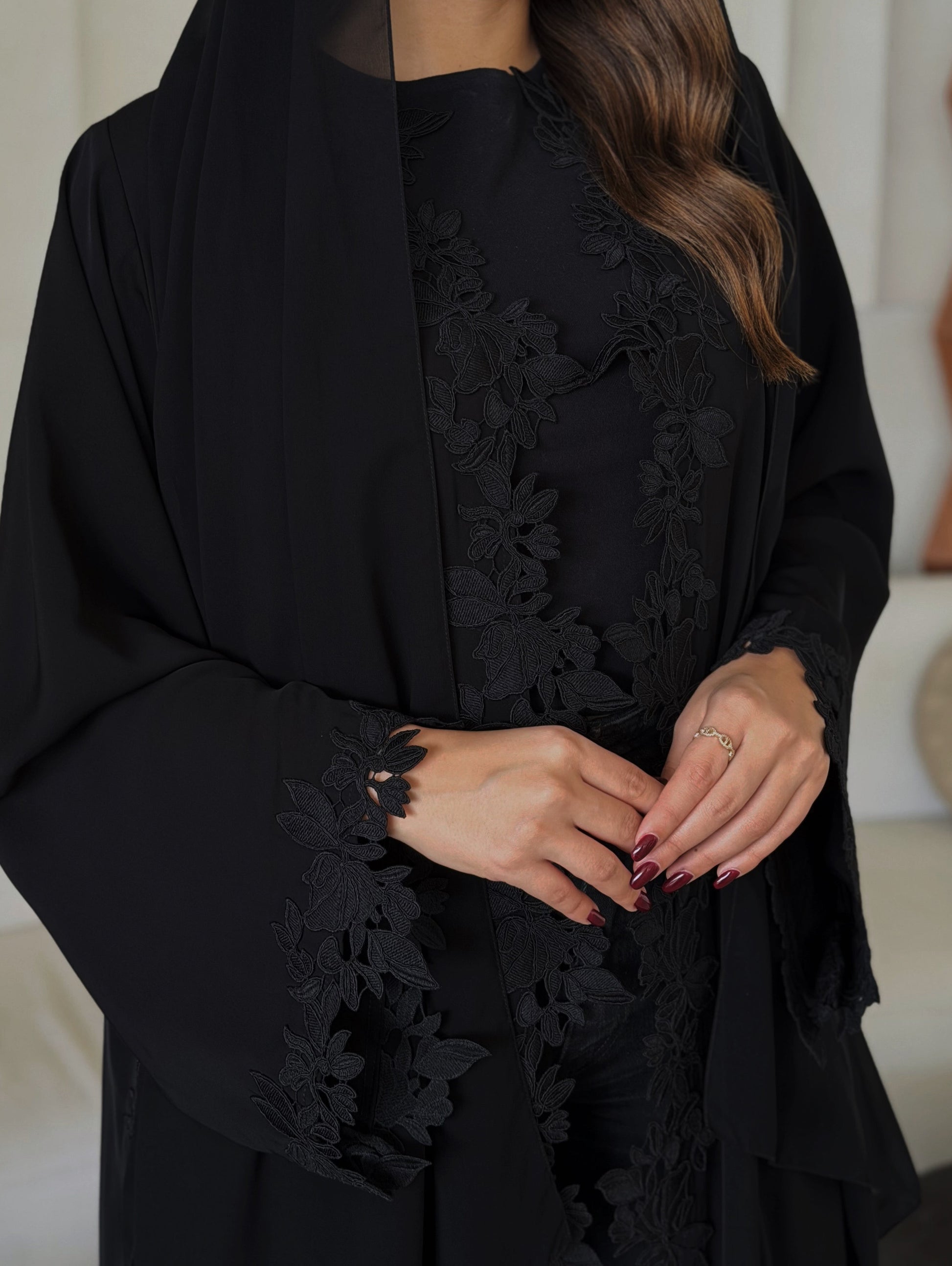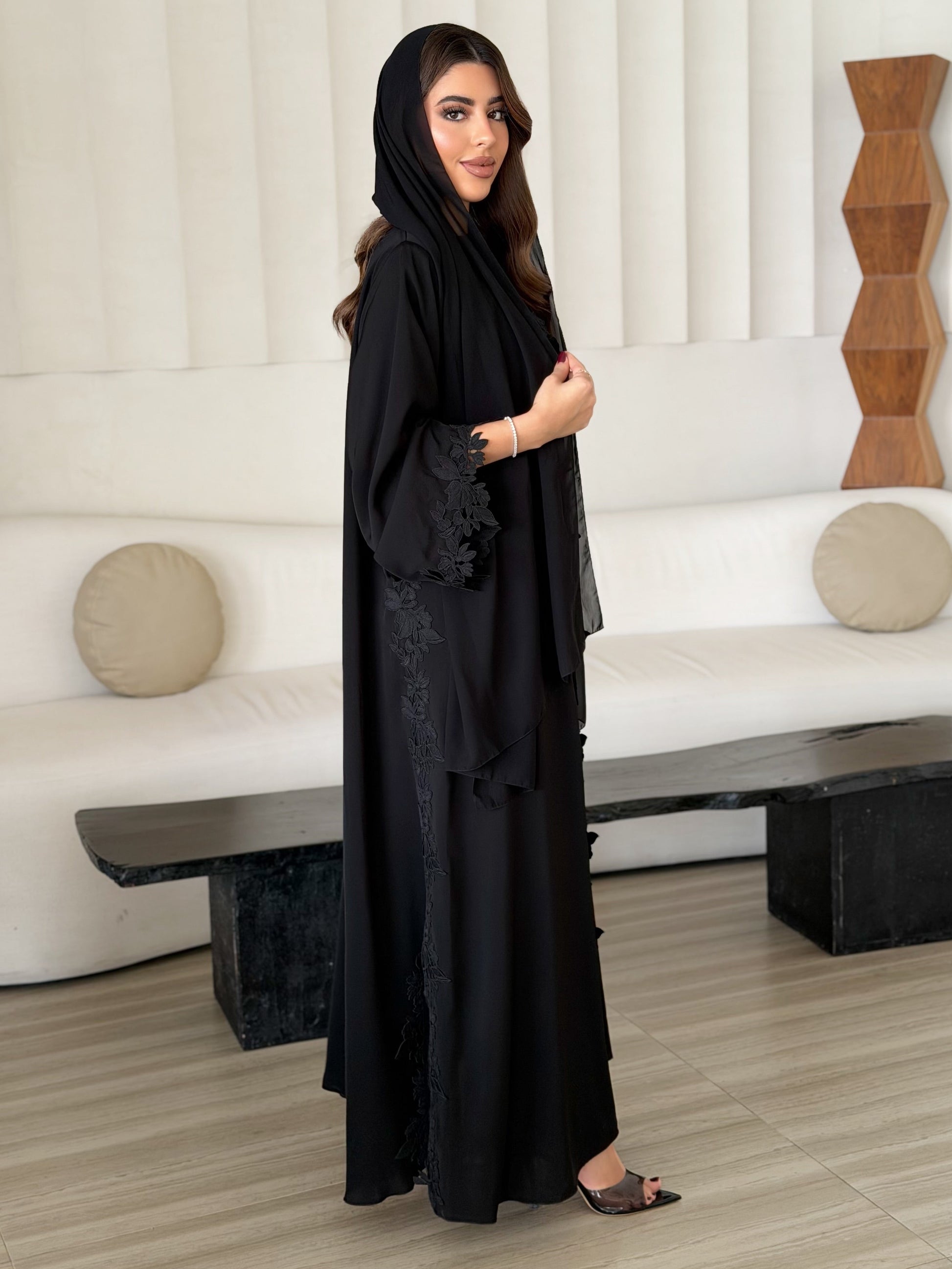 Black abaya with a touch orchid black lace on front, sides and sleeves end, side slit, comes with a black shaila.