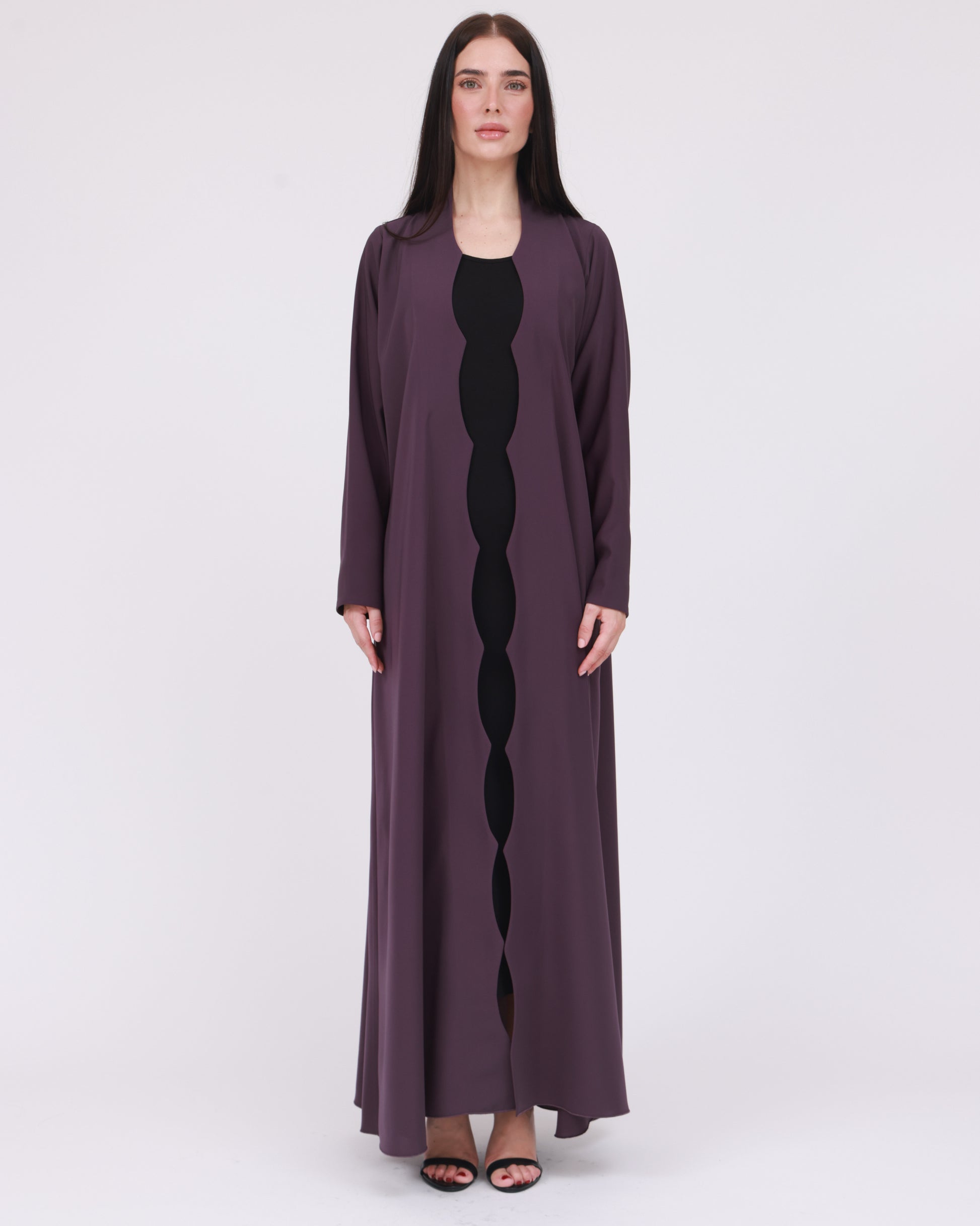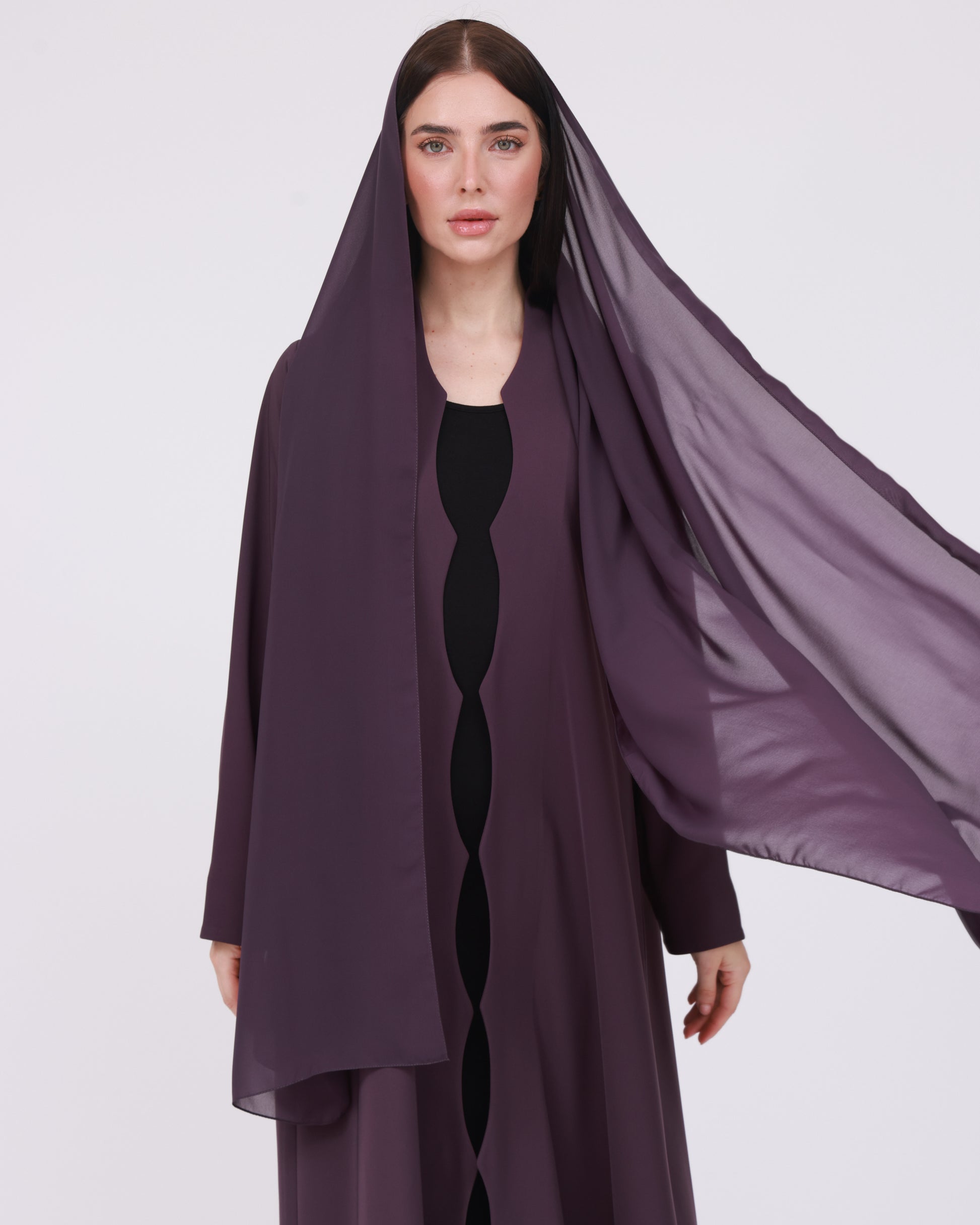 A flowy crepe abaya, featuring a curved front panel design that adds a soft modern edge, comes with a matching shaila and available in four different colors.