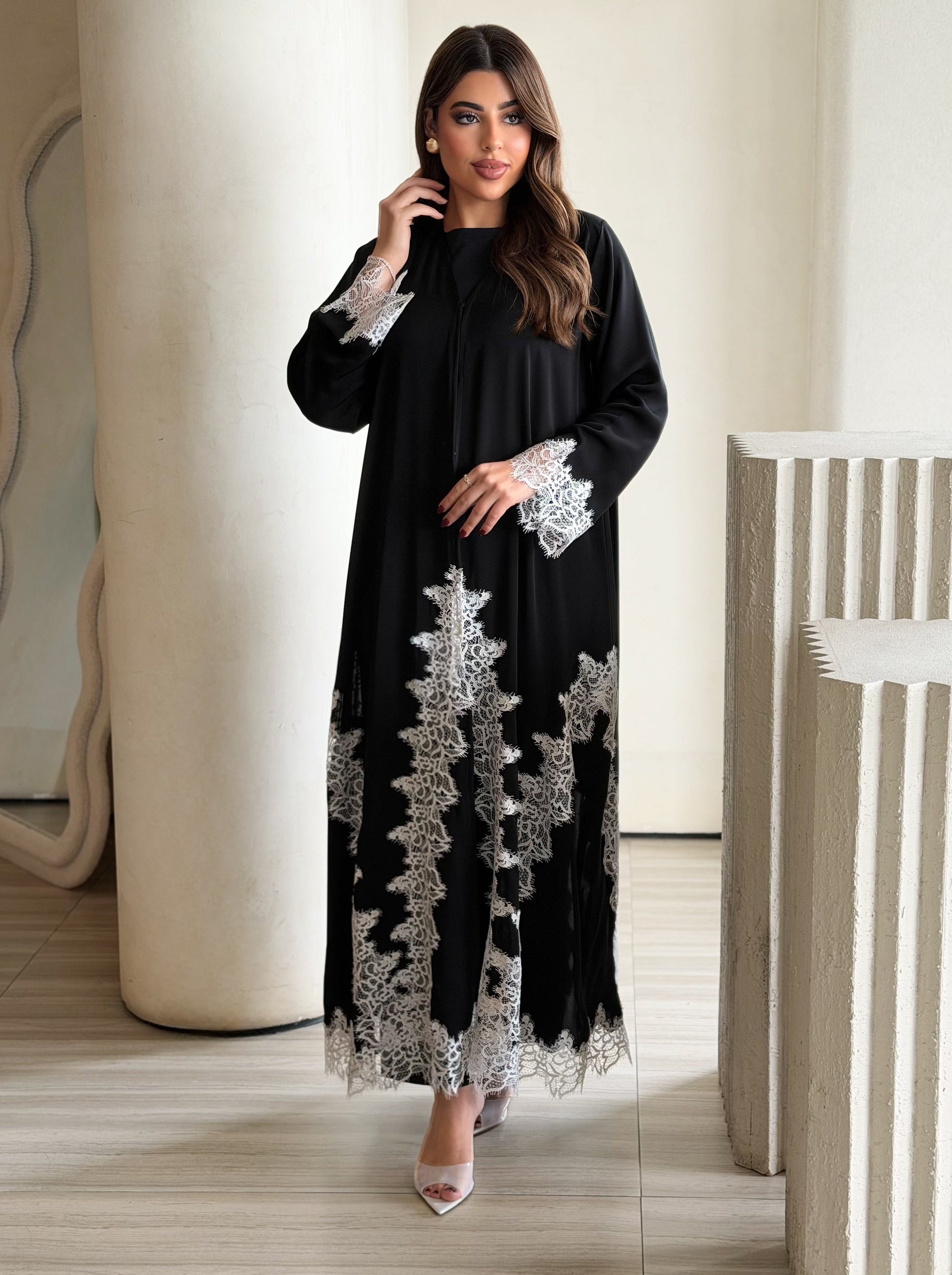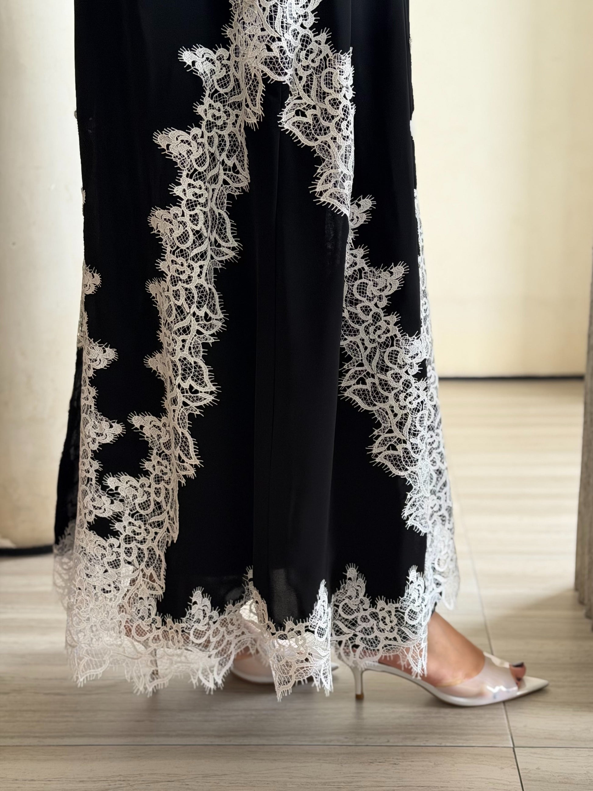 Black abaya with ivory color lace, giving an elegant finish on lower body and sleeves end, comes with black shaila.