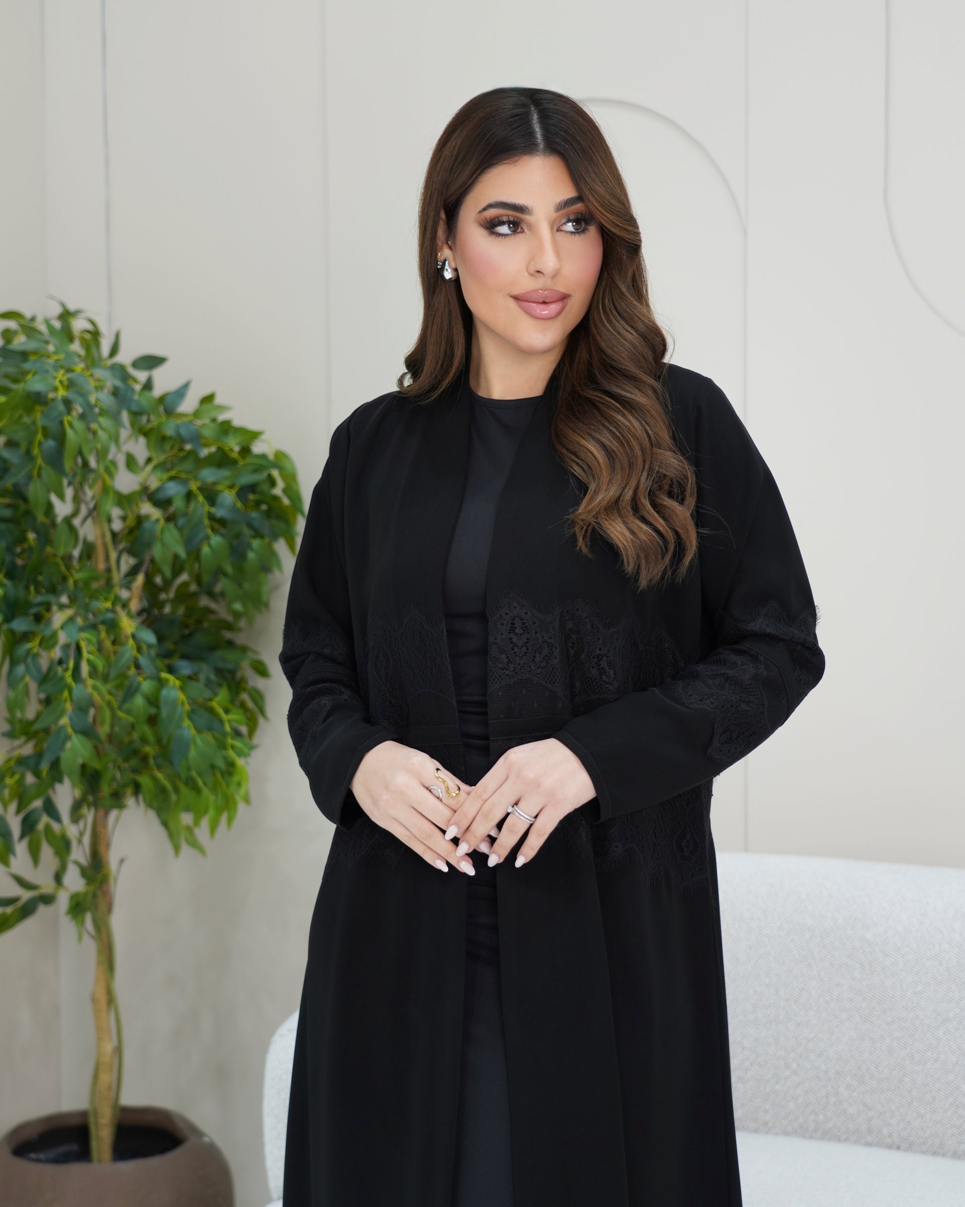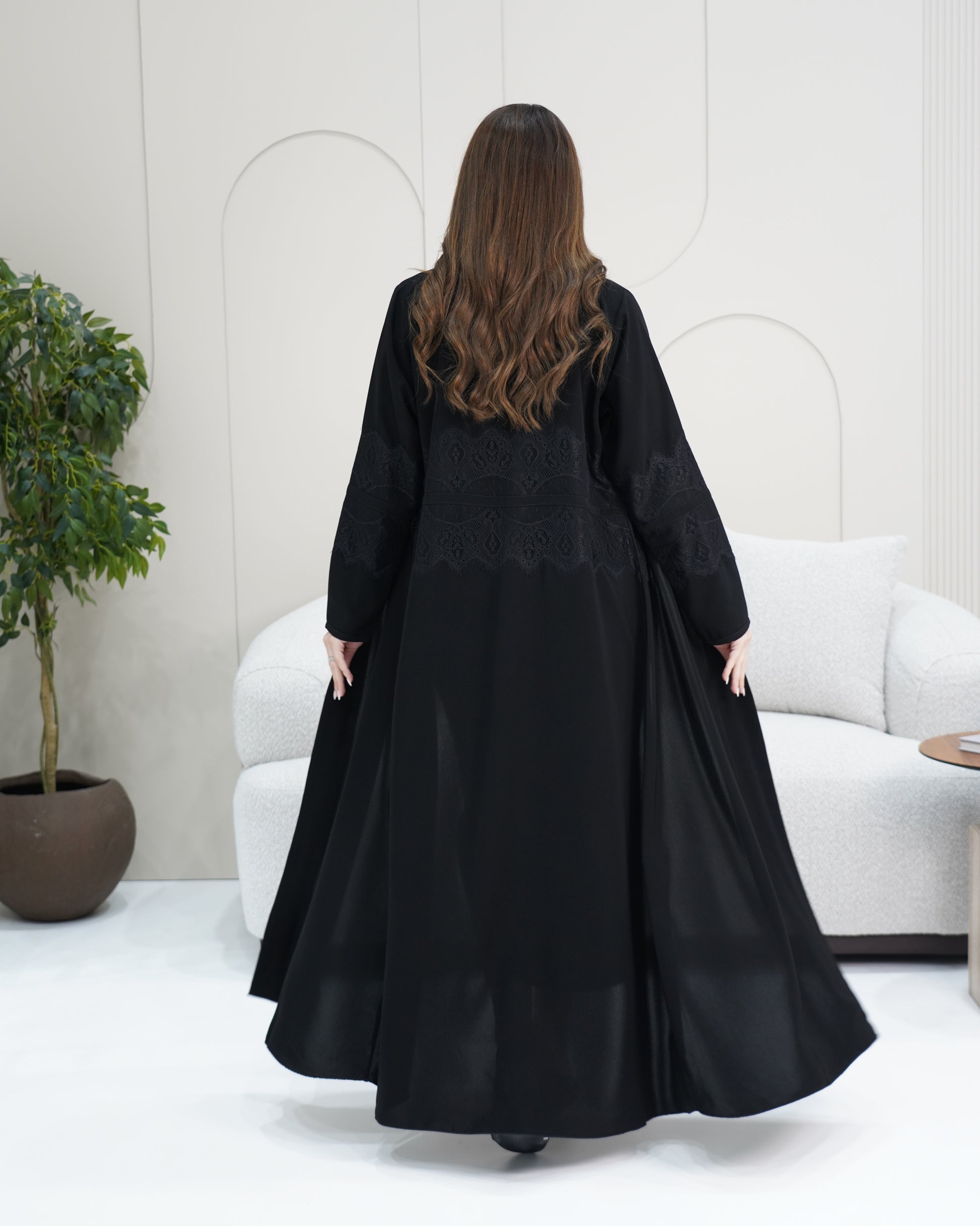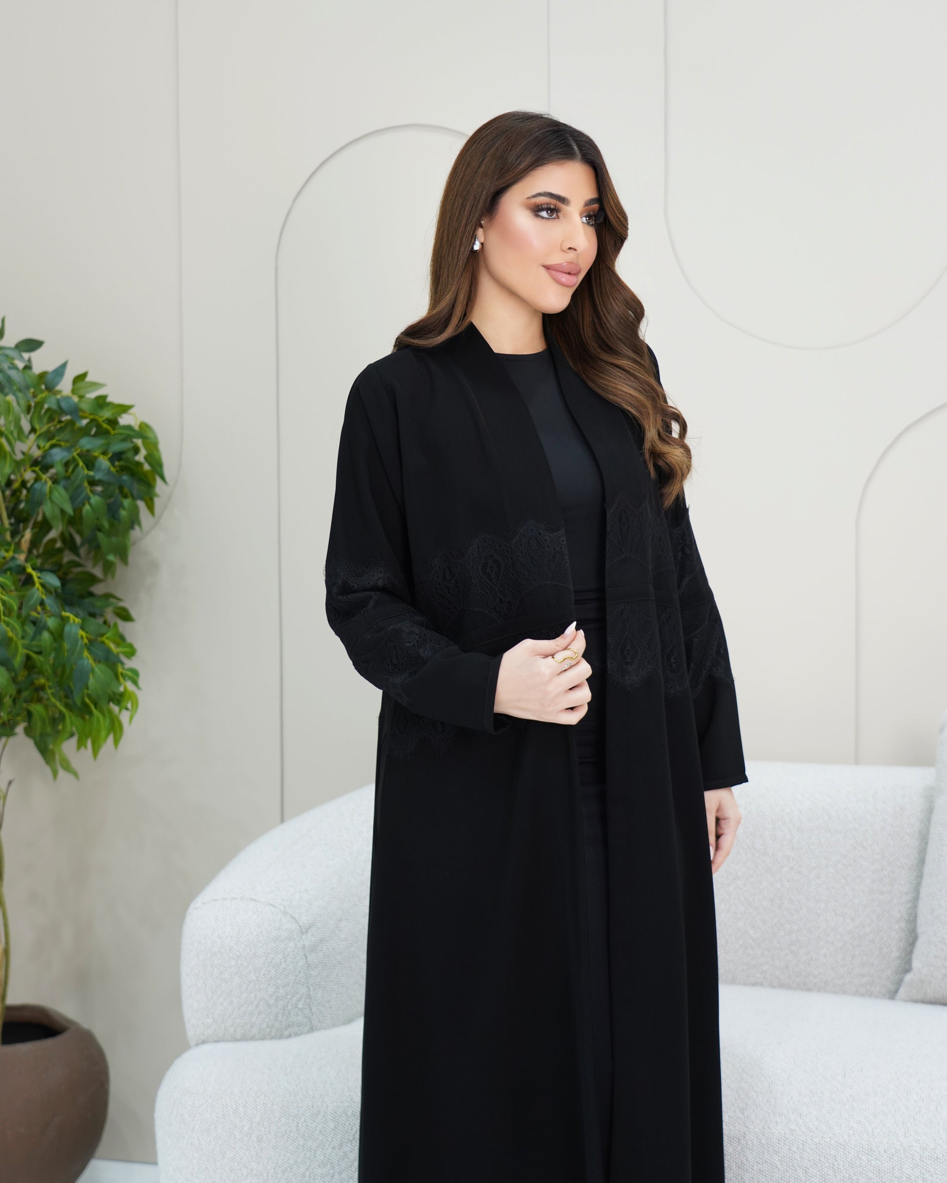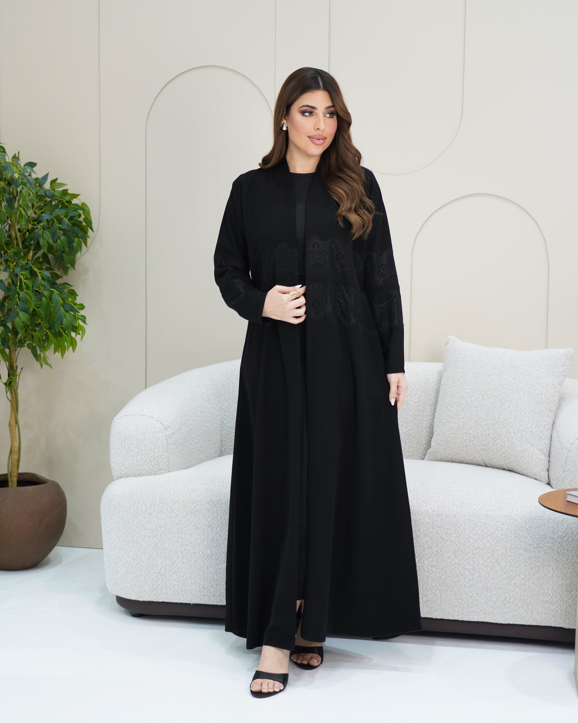 Black abaya with lace centered in the middle and sleeves, comes with black shaila.