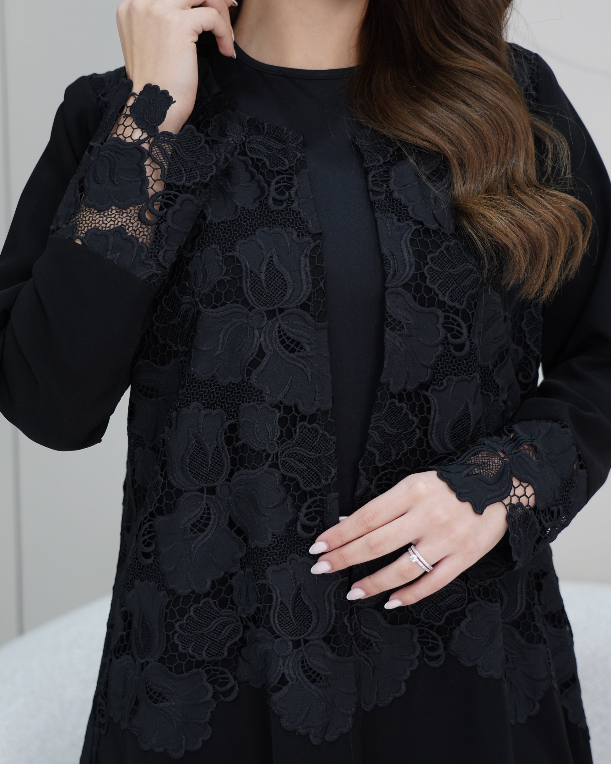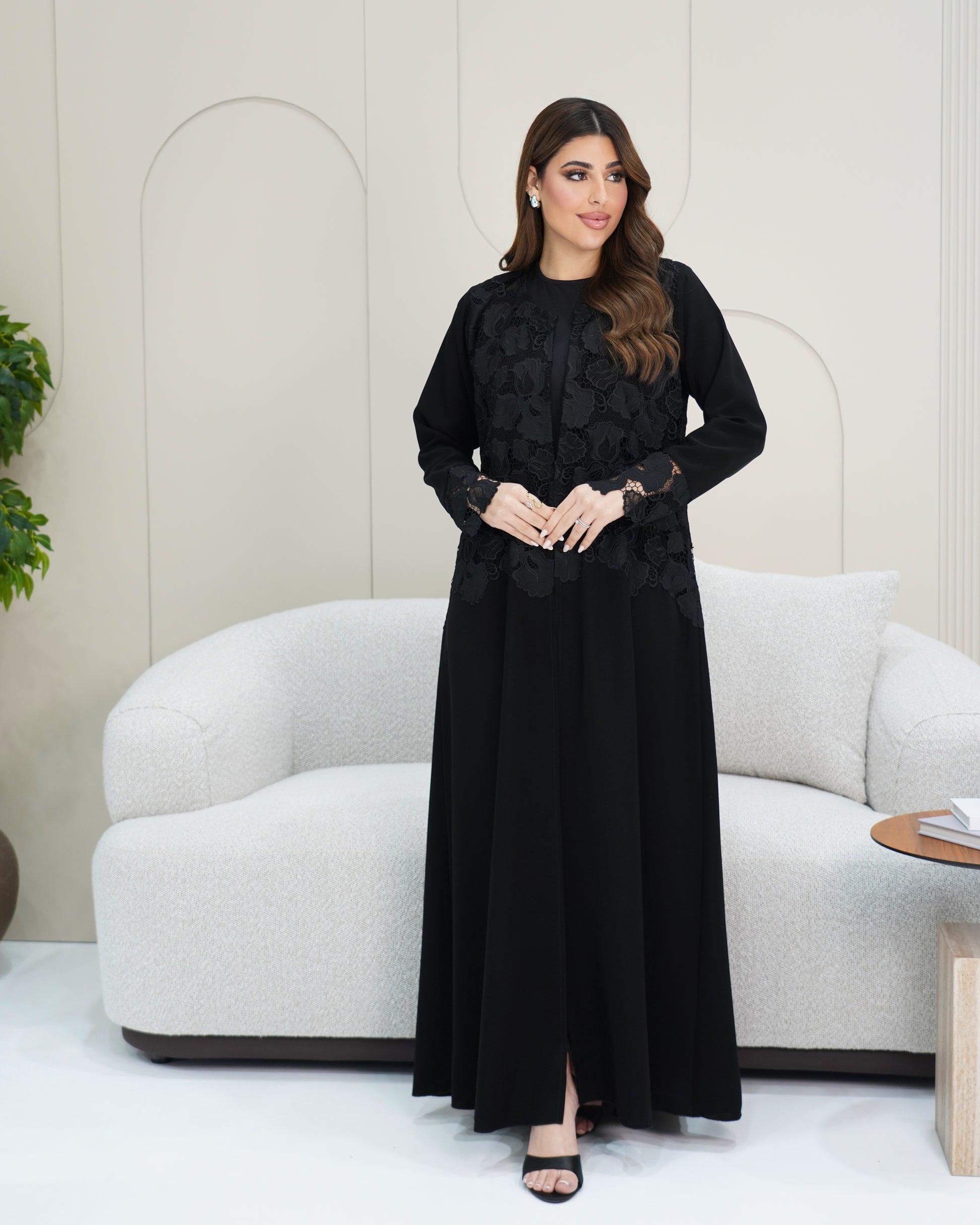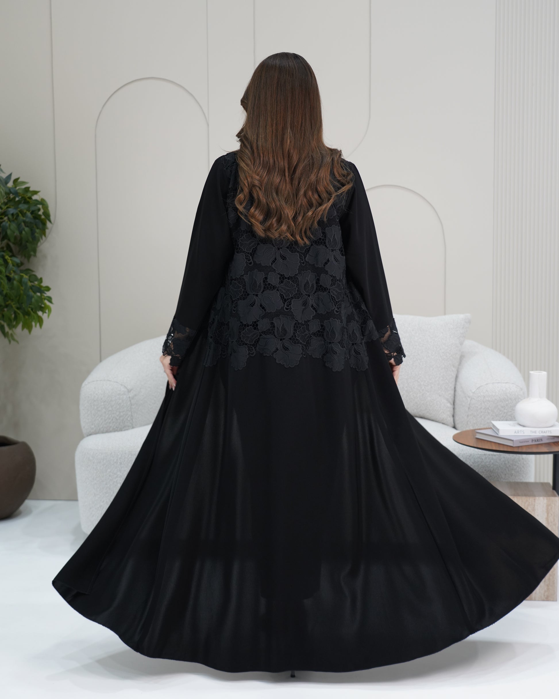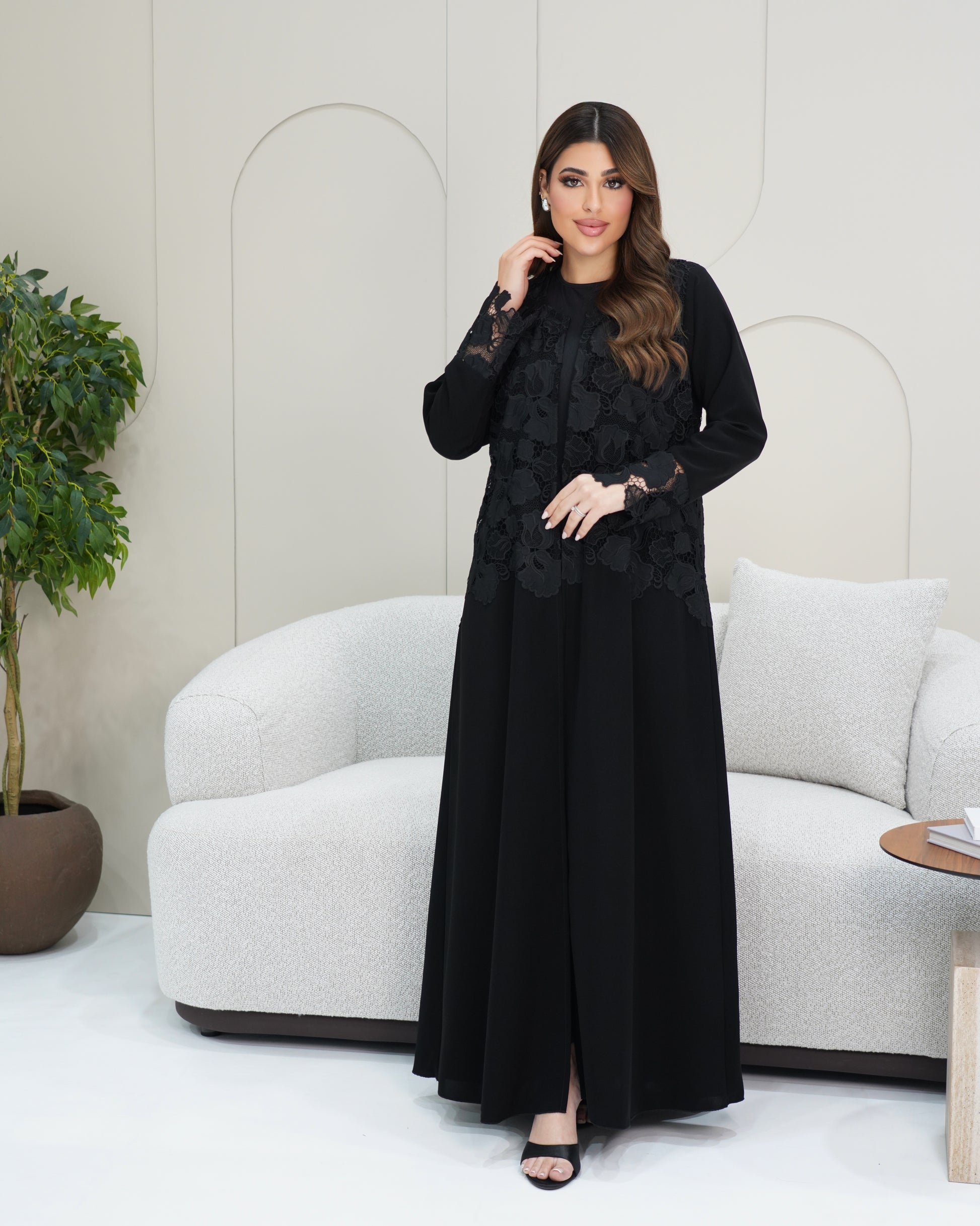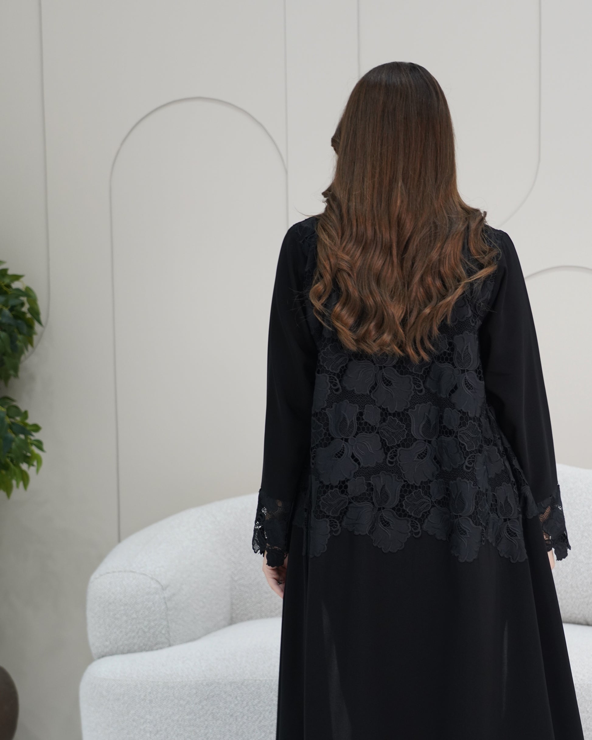Black abaya with black lace on upper abaya and sleeves end, comes with black shaila.