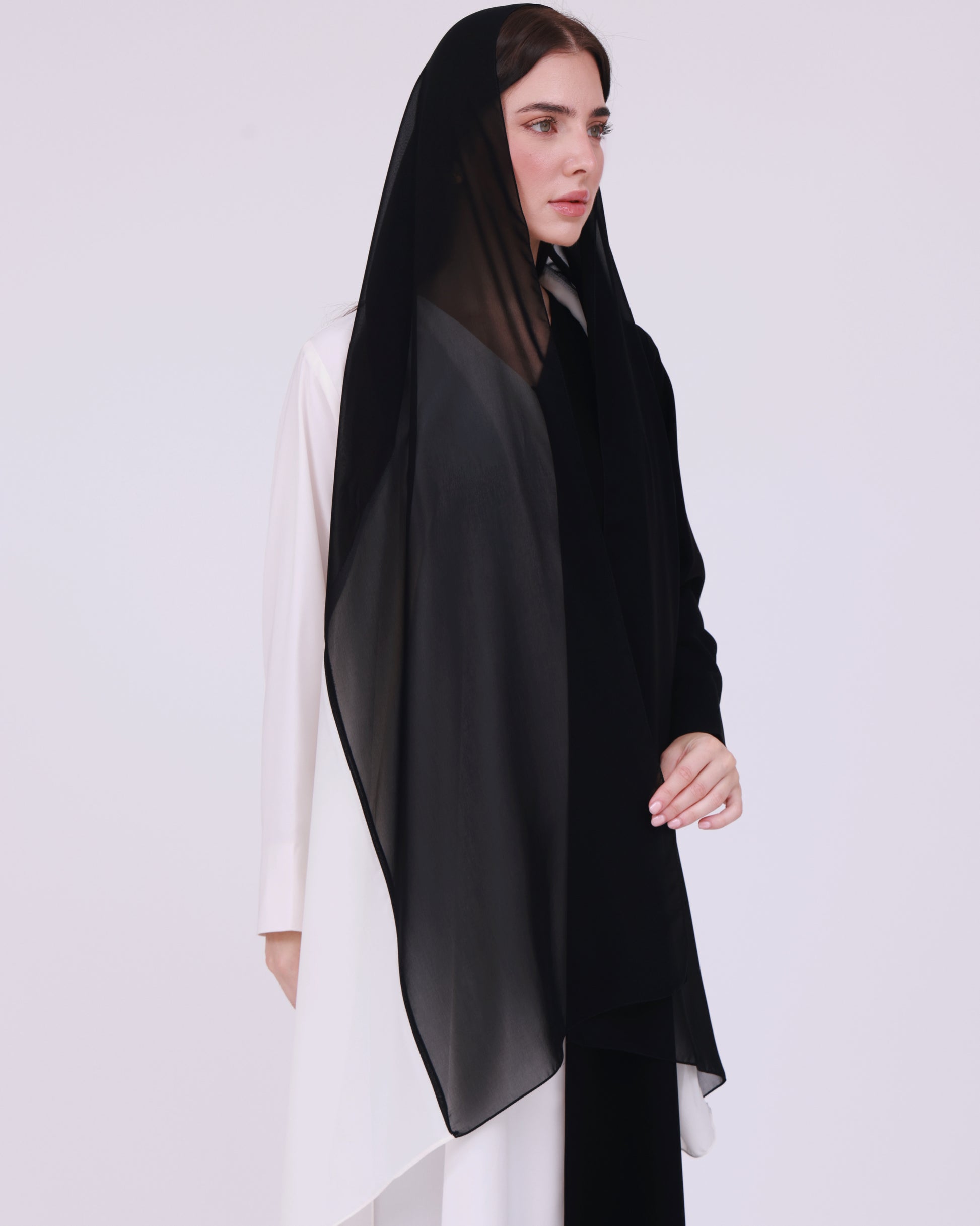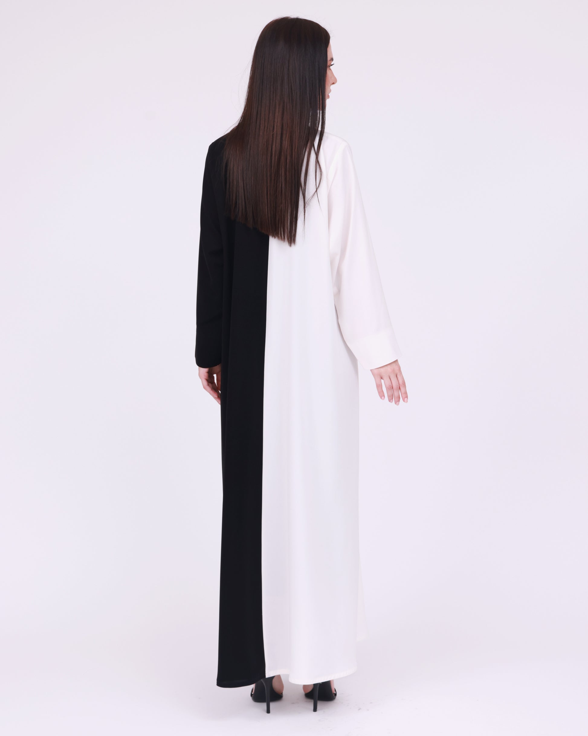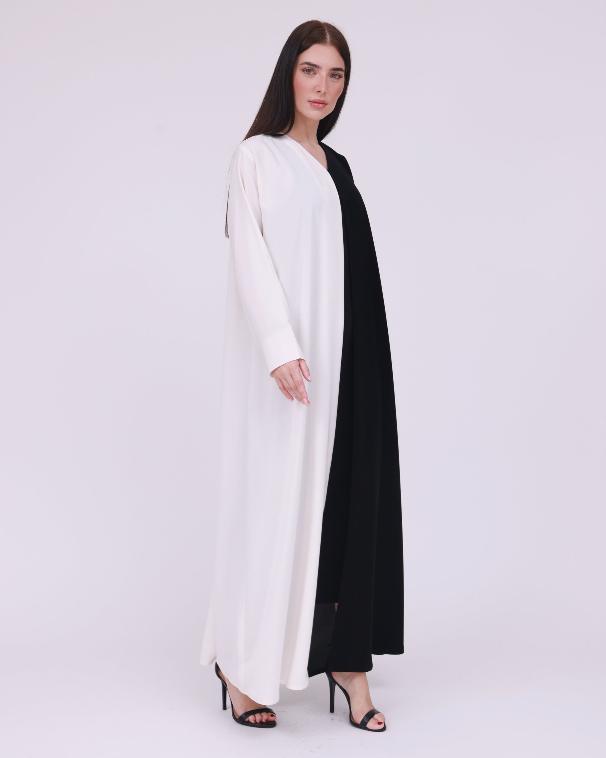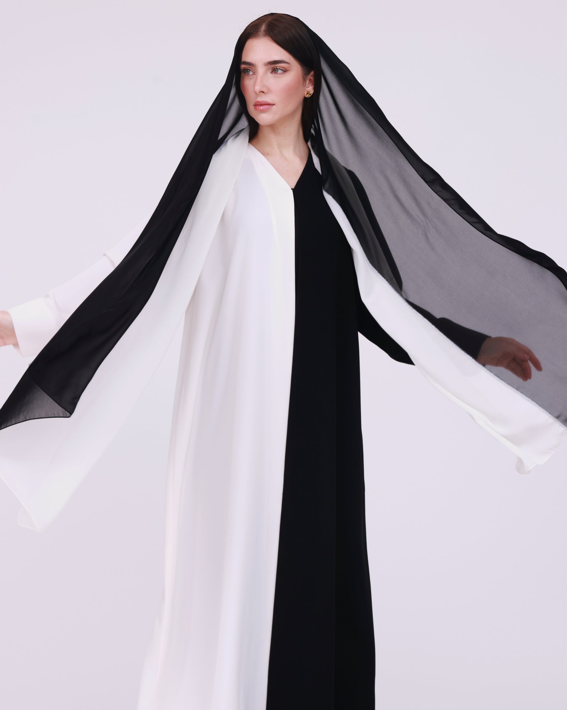 A soft crepe abaya, designed with a half black, half white design. Paired with a matching two tone shaila, it reflects balance for effortless style.