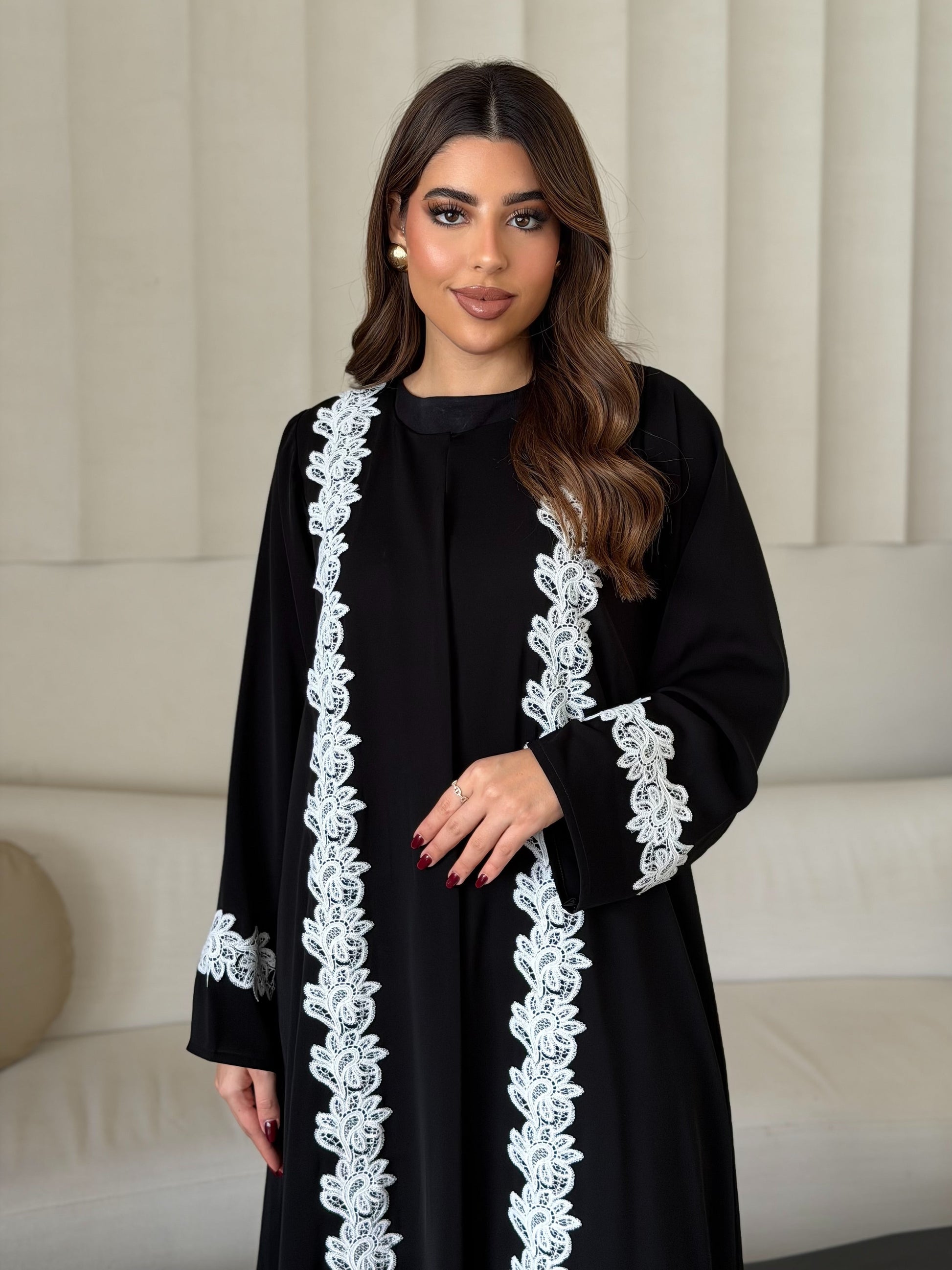 Black abaya, detailed with white lace touch across side and sleeves of the abaya, comes with black shaila.